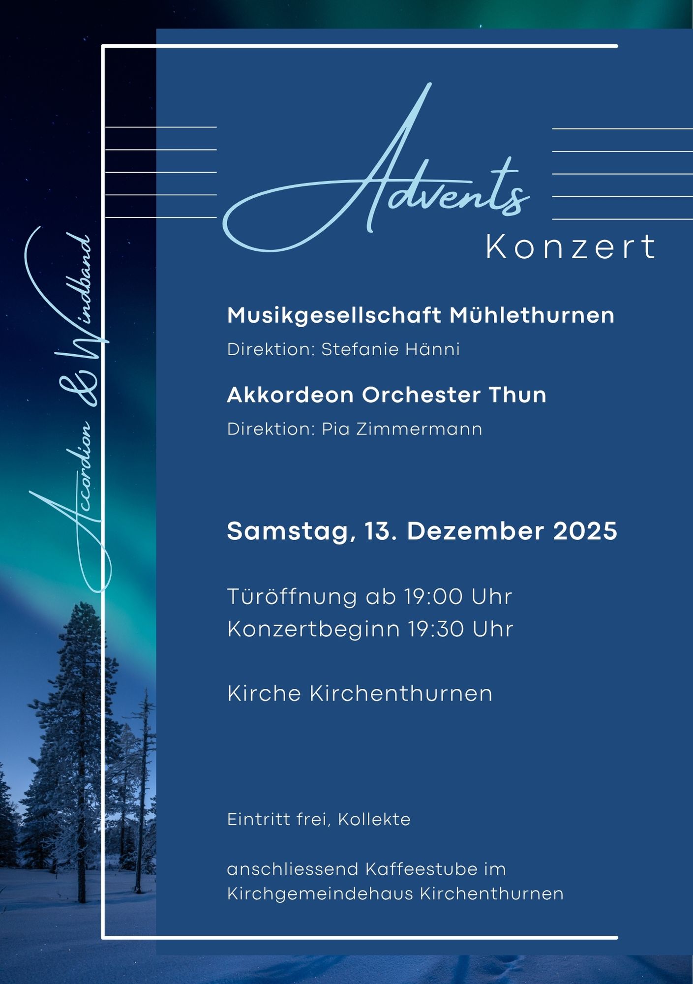 Durch unser Adventskonzert möchten wir euch wärme schenken und eine tolle gemeinsame Zeit mit Musik, Kuchen, etwas zu Trinken und vielen tollen Gesprächen. Kommt vorbei und geniesst unseren Vortrag zusammen mit dem Akkordeon Orchester Thun unter der Leitung von Pia Zimmermann. Zusammen mit ihnen werden wir unser Konzert gestalten, lasst euch durch die verschiedenen Klänge inspirieren und verwöhnen.