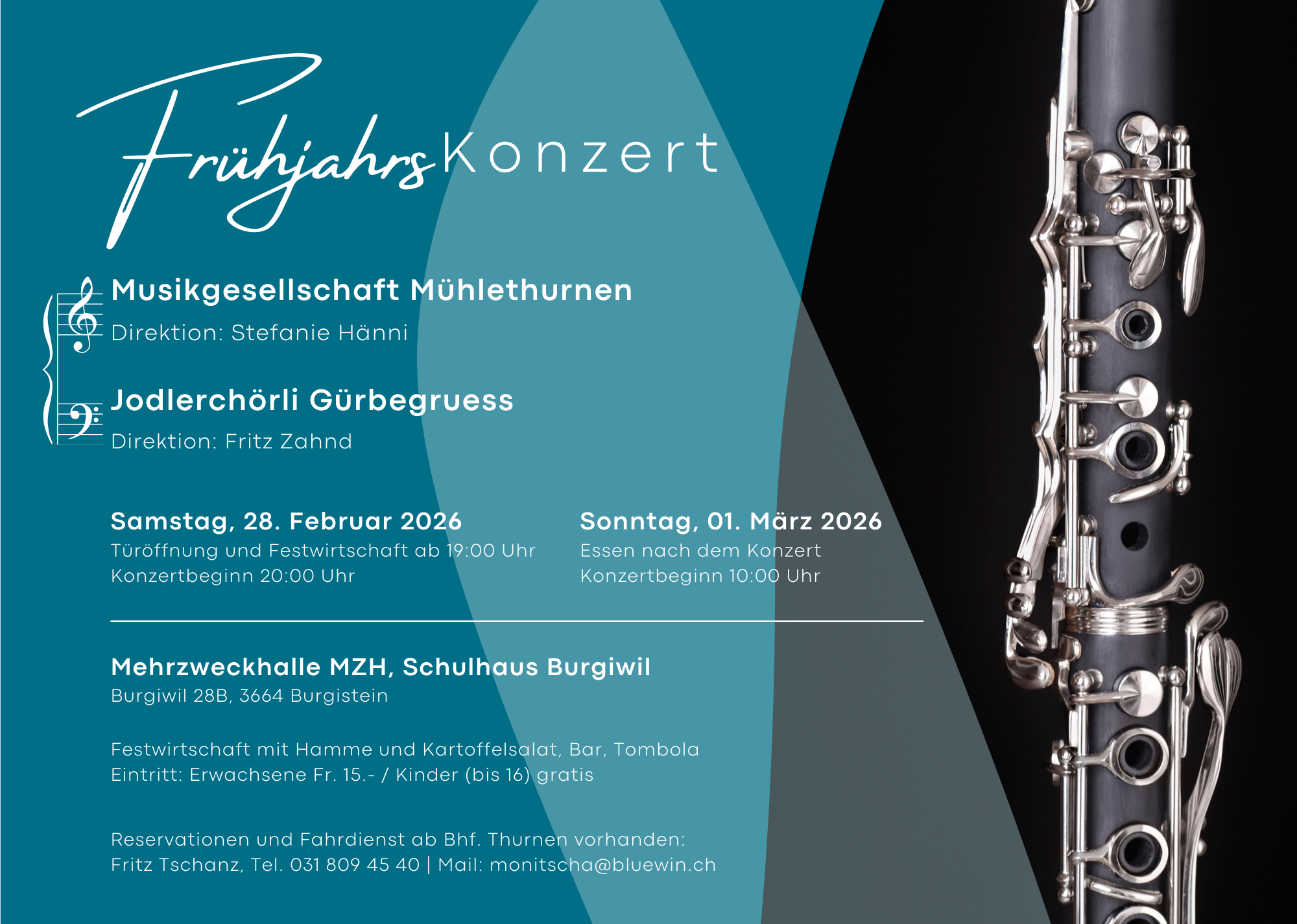 In diesem Jahr findet ein Frühjahrskonzert statt mit dem Jodlerchörli-Gürbegruess. Home Page (Jodlerchörli-Gürbegruess) Wie auch schon im letzten Jahr findet unser Konzert in der Merzweckhalle Burgistein statt. Wir freuen uns auf euren Besuch schon früh in diesem Jahr und begeistern euch mit musikalischen Klängen, gutem Essen und durstlöschenden Getränken.